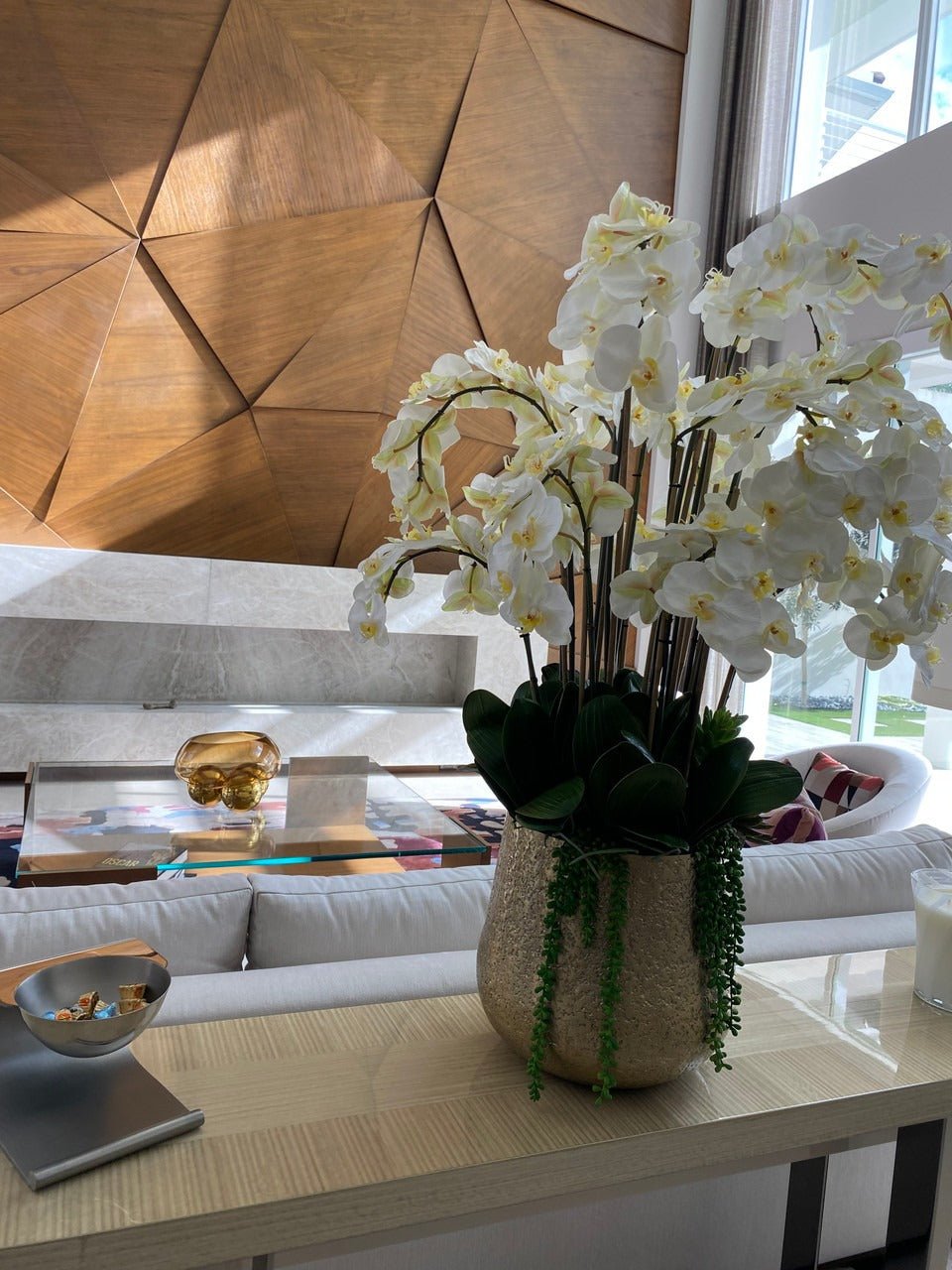 Often called the moth orchid. the Phalaenopsisis a favorite among our designers for its dense leaves. elegantly arching sprays. and lovely white blooms. Our remarkably lifelike arrangement is staked into a moss-covered Delany textured gold pot.Exceptional craftsmanship is presented at spectacular scale in this gorgeous white Phalaenopsis arrangement. showcased the Delany Pot which is cast from aluminum. then polished and electro-plated for a textured gold finish and simple silhouette. It’s designed for drama and destined to get attention: Display it on your dining room tabletop. or let this Phalaenopsis orchid make a great first impression in the foyer.
